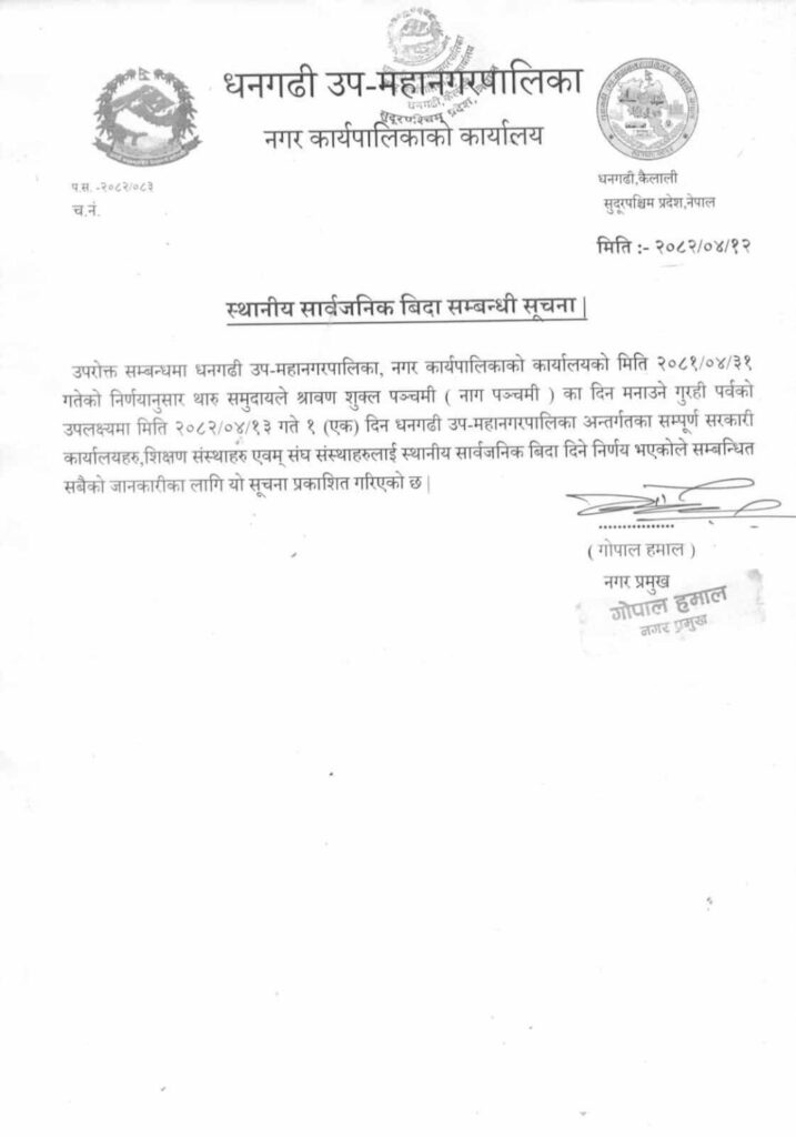 धनगढी, १२ श्रावण । कैलाली जिल्लाको विभिन्न स्थानीय तहले गुरही/गुरिया पर्वको अवसरमा स्थानीय सार्वजनिक बिदा दिएका छन् ।