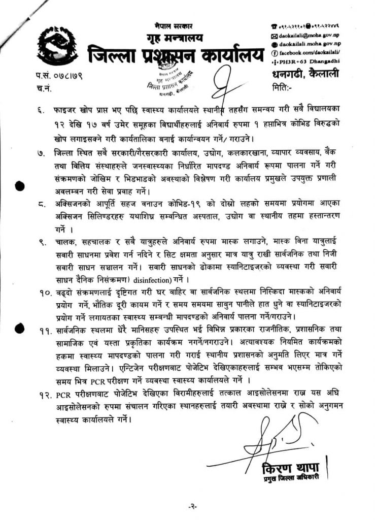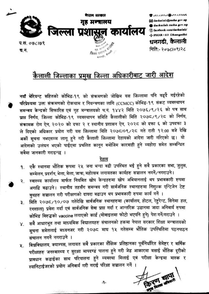 जिल्ला प्रशासन कार्यालय कैलालीकाे  आदेश जारी, आज रातिदेखि लागू हुने
