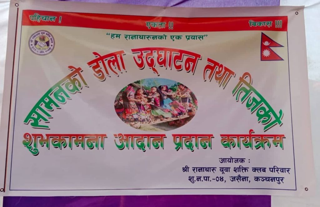 रानाथारु सामुदायमा तिजको रौनक, गाउ गाउमा सामनको डोला ( पिङ्ग) हाल्नेको होडबाजी देखिएको छ । आज शुक्ला फाँटा नगर पालिका वडा नं. ४ अशैना गाउमा सामनको डोला (पिङ्ग)को उदघाटन प्रदेश साँसद मननिय श्यामलाल रानाले गर्नु भएको छ । वहाँ कार्यक्रमको प्रमुख अतिथी रहनु भएको थियो । कार्यक्रमको शुभकामना दिदै वहाँले भन्नु भयो “रानाथारु दिदीबहिनिहरुले मनाउने तिज पर्व लोपहुने आवस्थामा पुगेको र यसलाई संरक्षण तथा समवद्घन राज्यले गर्दिनु पर्ने बताए ।”