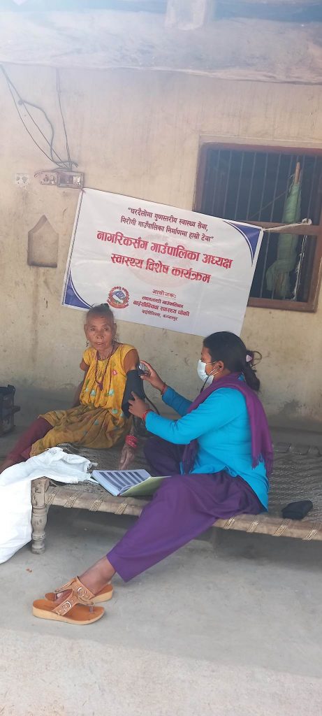 नागरिकको घर दैलोमा गई स्वस्थ सेवा निरोगी गाउँपालिकामा स्वस्थ सेवा सहज तरिकाले पुर्याउने उद्यस्यका साथ उच्च रक्तचाप, मधुमेह, मिर्गौला पीडित, कोबिट, दीर्घ रोगी लगायतका रोगहरू खोज पताल गरी जानकारी लिने र उपचार योजना बनाउने स्वास्थ संयोजक चौधरीले बताउनु भएको छ। घर दैलो कार्यक्रम प्रतेक वार्डमा गई स्वास्थ सेवा दिने र आगामी दिनको योजनाका साथसाथै वर्तमानको अवस्थाकाे बारेमा स्वस्थ अवस्था बुझी उपचारको योजना बनाउनेचौधरीले बताउनु भएको छ।