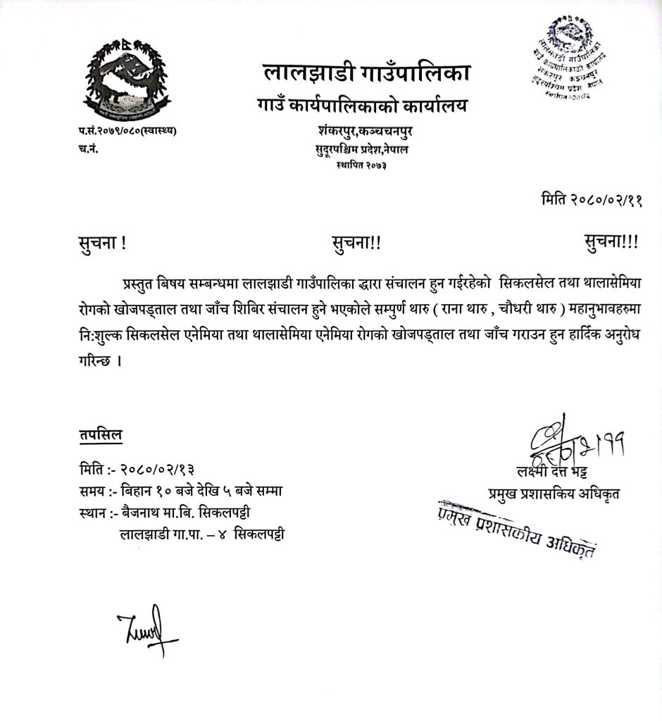 लालझाडी गाउँपालिका द्वारा सिकलसेल तथा थालासेमिया राेगकाे खाेजपड्ताल तथा जाँच शिबिर संचालन हुने भएकाेले सम्पुर्ण थारू ( राना थारू, चाैधरी थारू ) महानुभावहरूमा निःशुल्क सिकलसेल एनेमिया ताथ थालासेमिया राेगकाे खाेजपड्ताल तथा जाँच गराउन हुन लालझाडी गाउँपालिकाले हार्दिक अनुराेध गरेकाे छ ।