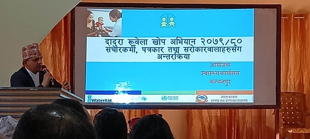 नरेश राना/कञ्चनपुर, २४ जेठ २०८० । कञ्चनपुरमा दादुरा रुवेलाको खोप अभियान संचालन हुने भएको छ । ६ महिनादेखि १५ वर्ष उमेरमुनिका बालबालिकालाई दादुरा–रुबेला खोप दिइने भएको स्वास्थ्य कार्यालय कञ्चनपुरले जनाएको छ । बुधवार दादुरा रुवेला खोप अभियान २०७९÷८० संचारकर्मी पत्रकार तथा सरोकारवालाहरुसंग गरिएको अन्र्तक्रिया कार्यक्रममा जिल्लामा रहेका १ लाख १४ हजार ६ सय २३ जना वालवलिकाहरुलाई खोप दिईने भएको हो ।
