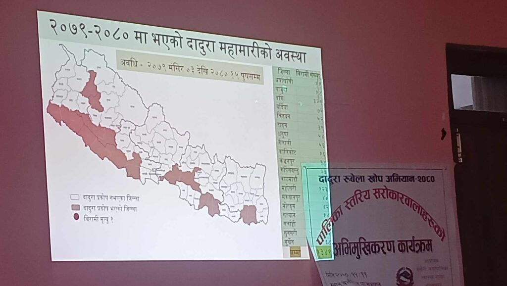बेलौरीमा नगरपालिका स्वास्थ्य शाखा, श्रीपुर प्राथमिक स्वास्थ्य केन्द्र लगायतका स्वास्थ्य संस्थाहरूमा सरोकारवालाहरुसँग अभिमुखीकरण कार्यक्रम गरी दादुरा रुबेला खोप सम्बन्धी जानकारी गराइएको छ ।