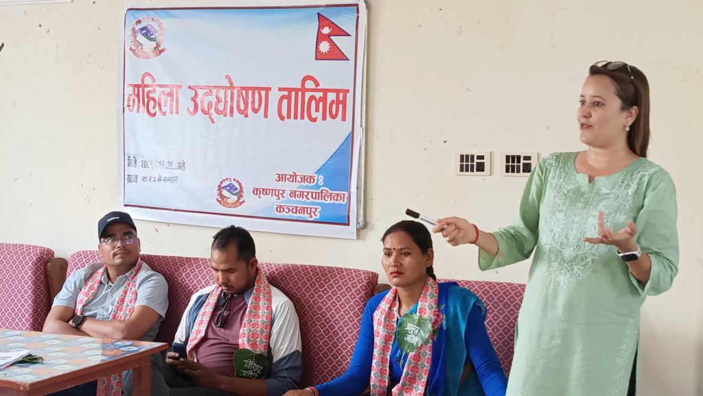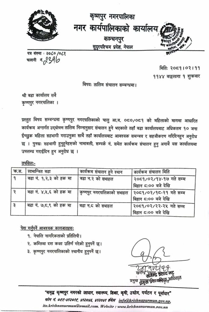 नरेश राना/कञ्चनपुर: कंचनपुरको कृष्णपुर नगरपालिकामा महिला उद्घोषण तालिम कृष्णपुर नगरपालिकाको आयोजनामा वडा नं १,२,३ मा कृष्णपुर-२ को सभाहलमा वडा नं २ का वडा अध्यक्ष अर्जुन सिंह साउदको अध्यक्षतामा उद्घाटन भएको छ ।