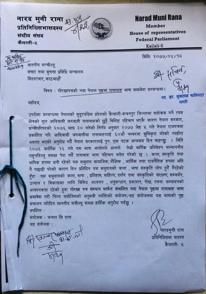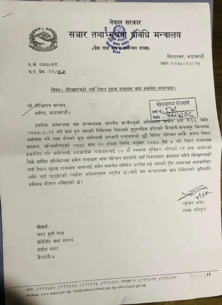 नन्दलाल राना, कैलाली । गोरखा पत्र संस्थान समितिको यही सोमबार सम्पन्न बैठकले रानाथारू भाषालाई गोरखापत्र दैनिकमा समावेश गरी प्रकाशन गर्ने निर्णय गरेको हो । रानाथारू भाषा समावेश भएसँगै गोरखापत्र दैनिकको नयाँ नेपाल बहुभाषा पृष्ठमा प्रकाशन हुने भाषाको सङ्ख्या ४४ पुगेको छ ।