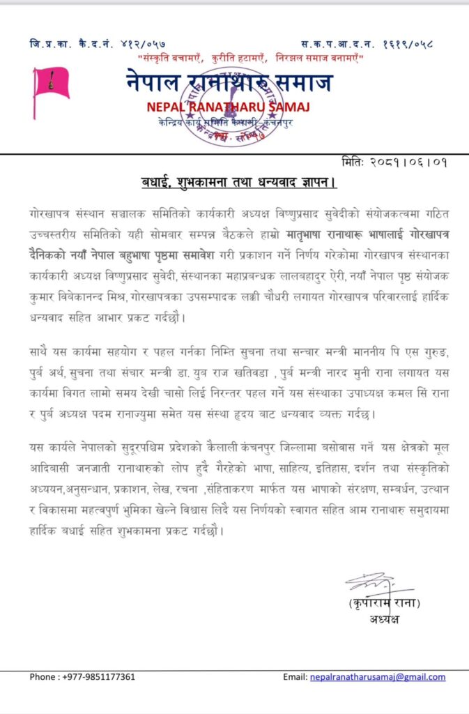 यस पत्रिकामा रानाथारु भाषाको पेज संप्रेसरण गर्नका लागि हामी निरन्तर प्रयासरतमा थियो भनेर नेपाल रानाथारु समाजका केन्द्रिय उपाधयक्ष कमल सिह रानाले जानकारी दिनुभयो । वहाँले भन्नुभयो,“यस कार्यमा सुचना तथा सञ्चार मन्त्री माननीय पि एस गुरुङ, पुर्व सुचना मन्त्री डा युव राज खतिवडा, पुर्व मन्त्री नारदमुनी राना, नेपाल रानाथारु समाजका अध्यक्ष कृपाराम राना, रानाथारु समुदायका अगुवाहरु, गोरखापत्र संस्थान संचालक समिति अध्यक्ष विष्णु प्रसाद सुवेशी र लक्की चौधरीको निरन्तर प्रयासमा गोरखापत्रको नयाँ नेपाल बहुृभाषा पेजमा रानाथारु भाषा पृष्ठ थपेर निकाल्न सफल भएका छौ ।”