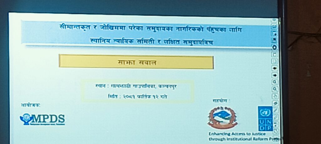 कञ्चनपुर को लालझाडी गाउँपालिका मा सीमान्तकृत र जोखिम मा परेका समुदायका नागरिकको चेतना तथा क्षमता गर्न स्थानीय तह मा सेवा प्रवाह र हकमा जनसहभागितामा अभिवृद्धिका लागि कानुनी मेला कार्यक्रम तथा साझा सवाल लालझाडी गाउँपालिका मा सम्पन्न भएको छ। UNDP को सहयोग तथा लालझाडी गाउँपालिका को सहकार्य र MPDS डडेलधुरा को आयोजन मा सो कार्यक्रम सम्पन्न भएको थियो।
