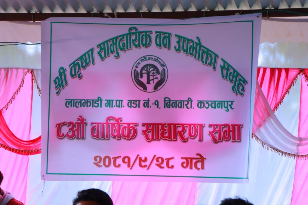 कञ्चनपुर को लालझाडी गाउँपालिका वडा नं १ मा रहेको श्री कृष्ण सामुदायीक वन उपभोक्ता समूह को ८औं वार्षिक साधारण सभा सम्पन्न भएको छ। साधारण सभामा सभापति श्री कृष्ण सामुदायीक वन उपभोक्ता समूह का अध्यक्ष दिनेश राना रहनु भएको थियो।