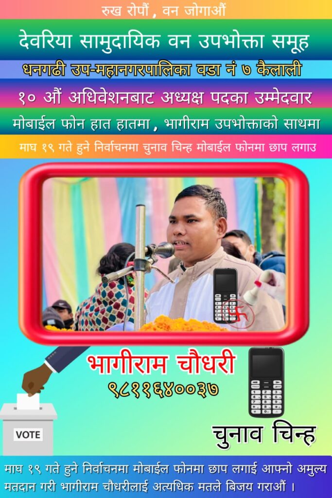 धनगढी उप-महानगरपालिका वडा नं. ७, कैलालीस्थित देवरिया सामुदायिक वन उपभोक्ता समूहको १०औं अधिवेशनबाट अध्यक्ष र टोल सदस्य पदका उम्मेदवार घोषणा गरिएको छ। अध्यक्ष पदका लागि भागीराम चौधरी (चुनाव चिन्ह: मोबाइल फोन) र टोल सदस्य पदका लागि चन्द्राकला खनाल (चुनाव चिन्ह: साइकल) प्रतिस्पर्धामा छन्।