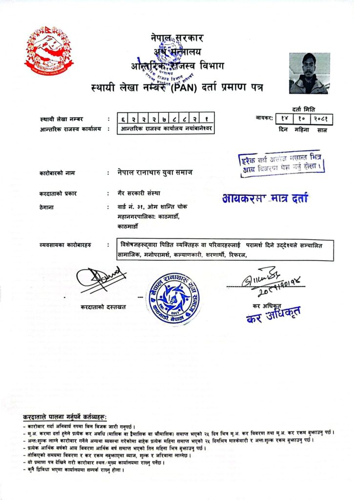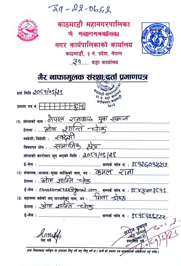 प्राप्त विवरणअनुसार, नवराज रानाले नेतृत्व गरेको प्रारम्भिक समिति बिचैमा टुटेको थियो। त्यसपछि कमल रानाको अध्यक्षतामा नयाँ तदर्थ समिति गठन भई सम्पूर्ण कागजी प्रक्रिया पूरा गरेर नेपाल रानाथारु युवा समाज विधिवत रूपमा काठमाडौंमा दर्ता गरिएको थियो। हाल संस्थाको दर्ता नं. १५७ र पान नं. ६२२२७८८२१ रहेको सम्पूर्ण कागजातहरू सरकारी अभिलेखमा सुरक्षित छन्।