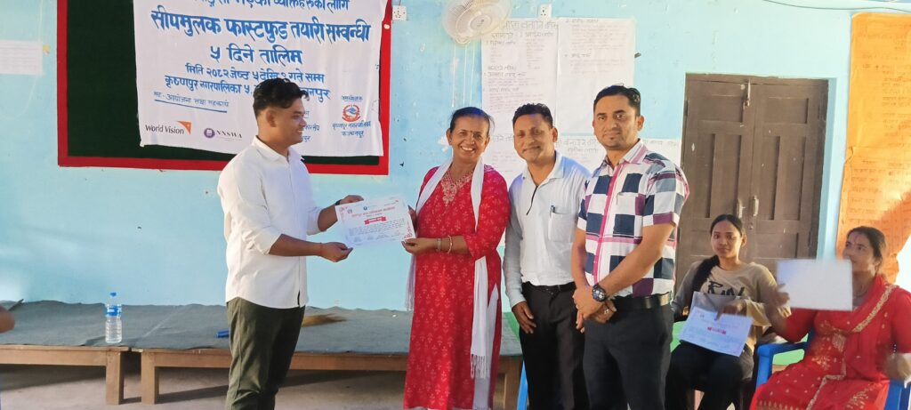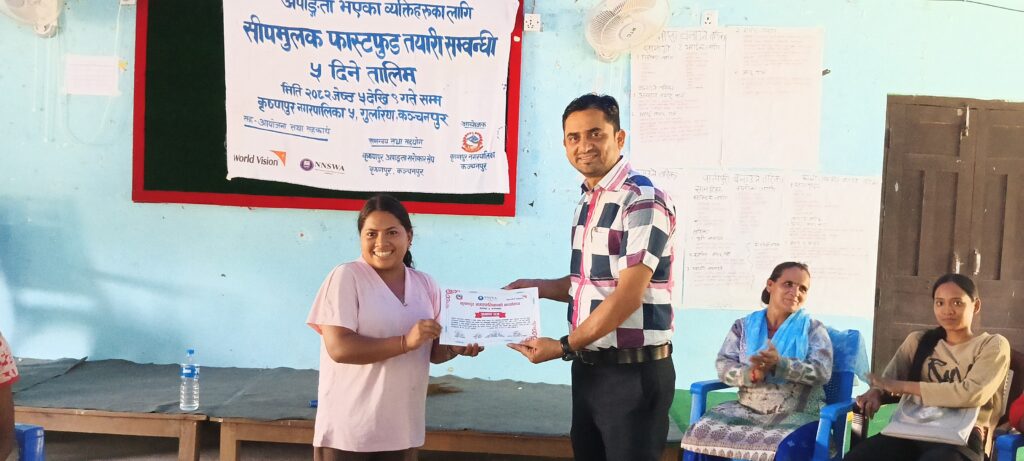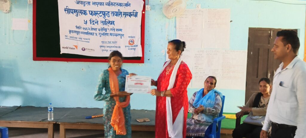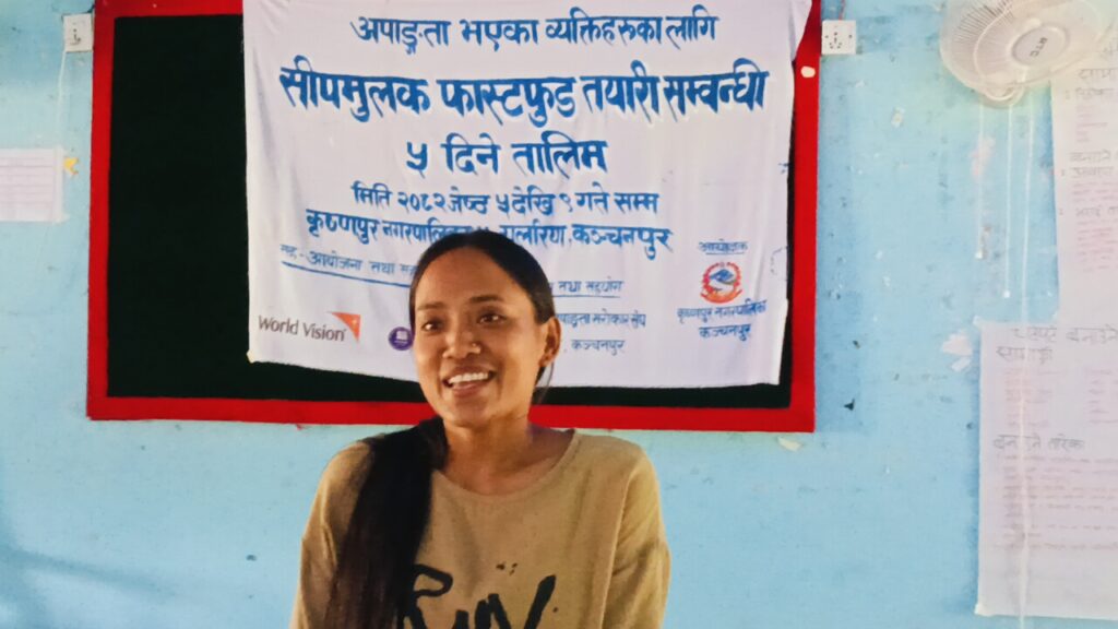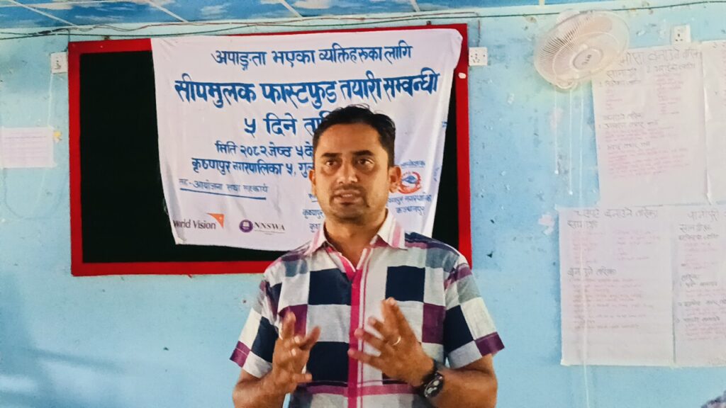 कञ्चनपुर: अपांगता भएका व्यक्तिहरुको सीप विकास तथा आत्मनिर्भरता प्रवर्द्धन गर्ने उद्देश्यले कृष्णपुर नगरपालिका अन्तर्गत पाँच दिने “सीपमूलक फास्टफुड तयारी तालिम” सम्पन्न भएको छ।