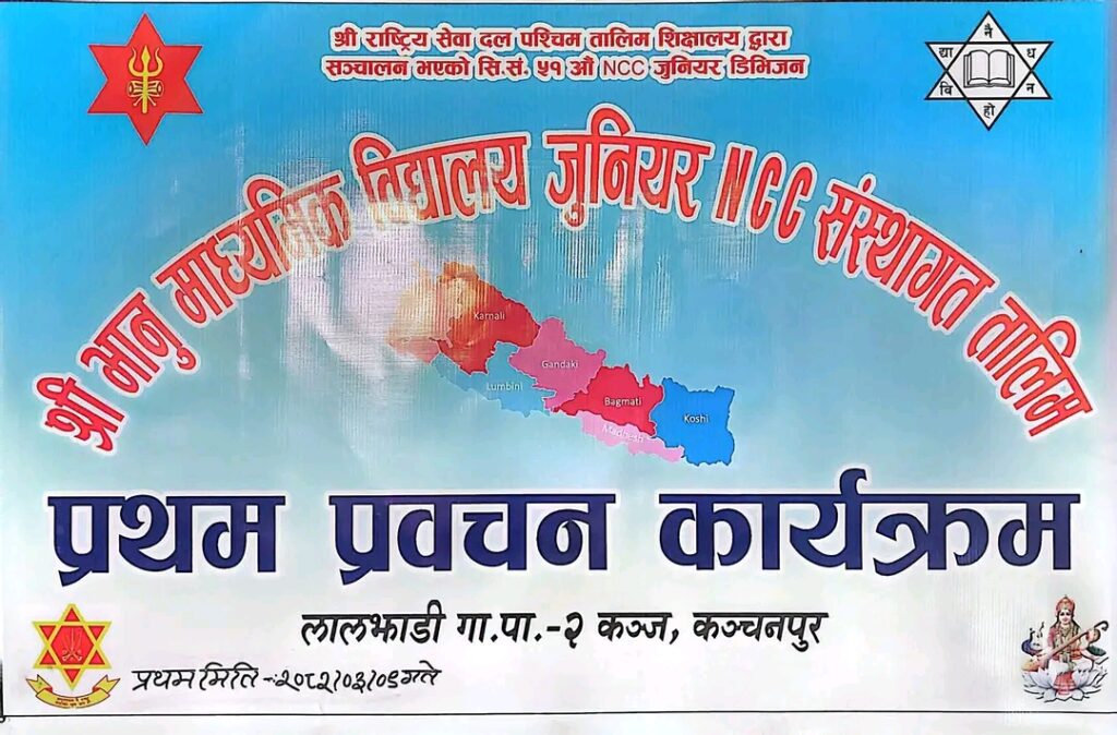 कञ्चनपुर: कञ्चनपुरको लालझाडी गाउँपालिका–२, कञ्जस्थित श्री भानु माध्यमिक विद्यालयमा राष्ट्रिय सेवा दल (NCC) जुनियर डिभिजन तालिम सोमबारदेखि औपचारिक रूपमा सुरु गरिएको छ। नेपाली सेनाको समन्वयमा सञ्चालन गरिएको यो तालिम अनुशासन, नेतृत्व विकास तथा राष्ट्रसेवाको भावना सशक्त रूपमा विकास गराउने उद्देश्यले सुरु गरिएको हो।