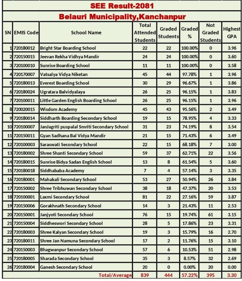 बेलौरी,२० असार।कञ्चनपुरको बेलौरी नगरपालिकामा रहेका ब्राइट स्टार बोर्डिङ स्कुल शान्तिपुर, जीवनदेखा विद्यामन्दिर रतनपुर, र सनराइज बोर्डिङ स्कुल गोकलपुरले एसइई परीक्षामा शत प्रतिशत नतिजा ल्याउन सफल भएको छ।ब्राइट स्टार बोर्डिङ स्कुल शान्तिपुरबाट एसइई परीक्षामा २२ जना विद्यार्थीहरू सहभागी मध्ये २२ जना उत्तीर्ण,जीवनदेखा विद्यामन्दिर रतनपुरबाट २४ जना मध्ये २४ जना उत्तीर्ण,र सनराइज बोर्डिङ स्कुल गोकलपुरबाट सहभागी ११जना सहभागि विद्यार्थीमा सबै उत्तीर्ण भएका छन्।प्रकाशित भएको एसइईको नतिजा अनुसार बेलौरी नगरपालिका वडा नम्बर ७ मा रहेको गणेश माध्यामिक विद्यालय बरैया निल भएको छ।
