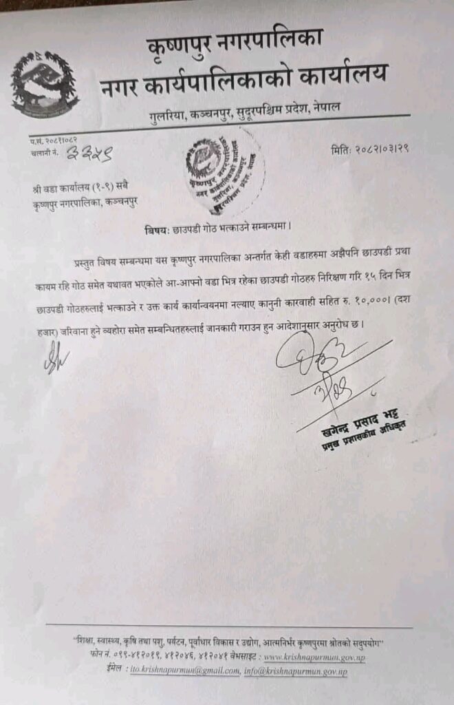 कृष्णपुर । कञ्चनपुरको कृष्णपुर नगरपालिकाले नगरभित्र रहेका छाउ गोठ १५ भित्र भत्काउन निर्देशन दिएको छ।