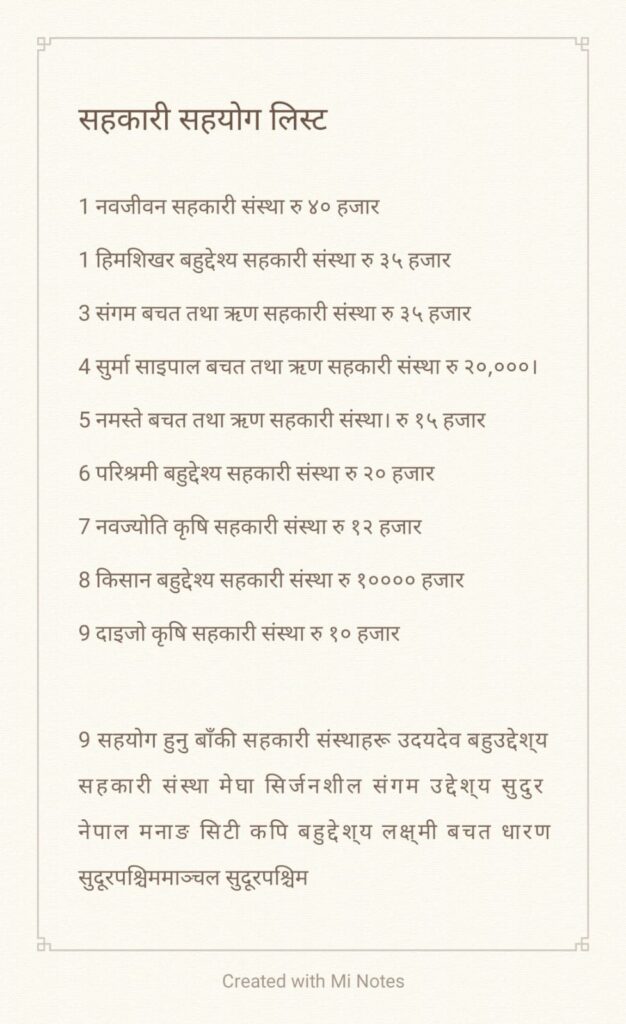 धनगढीः मालपोत कार्यालय धनगढीलाई यस क्षेत्रका विभिन्न सहकारी संस्थाहरूले संयुक्त रूपमा ३ लाख १५ हजार रुपैयाँ आर्थिक सहयोग हस्तान्तरण गरेका छन्।मंगलवार मालपोत कार्यालय परिसरमा आयोजित एक कार्यक्रमका बीच उक्त सहयोग रकम सहकारी प्रतिनिधिहरूको तर्फबाट नवजीवन सहकारी संस्थाका अध्यक्ष देवबहादुर बमले मालपोत कार्यालयका प्रमुख प्रेम दौल्याललाई हस्तान्तरण गरेका हुन्। कार्यक्रममा मालपोतका पदाधिकारीहरू, सहकारी संस्थाका अध्यक्ष तथा सदस्यहरू र कार्यालयका कर्मचारीहरूको उपस्थिति रहेको थियो।