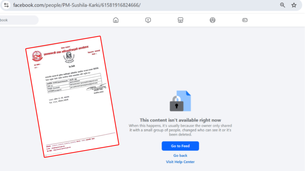 काठमाडौँ । आइतबारदेखि सञ्चालनमा आएको प्रधानमन्त्री सुशीला कार्कीको आधिकारिक फेसबुक ‘अकाउन्टु गायब भएको छ । ‘PM Sushila karki’ नामक आधिकारिक फेसबुक अकाउन्ट सोमबार बेलुकादेखि नखुल्ने भएको छ ।