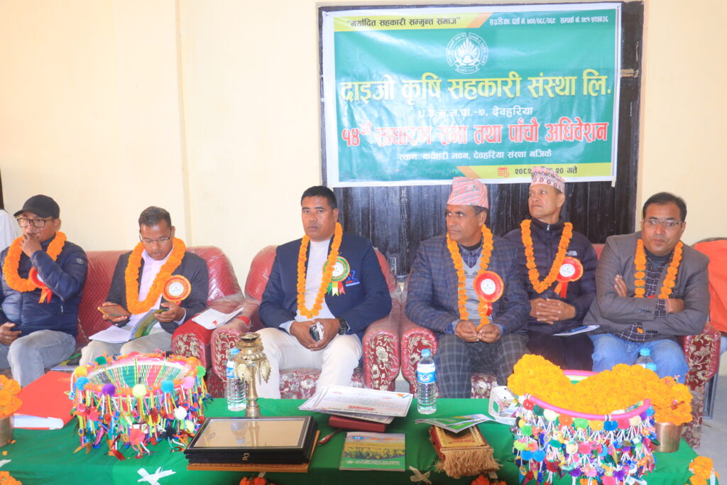 कैलाली । धनगढी उपमहानगर पालिका वडा नम्बर ७ देवहरीया स्थित दाइजो कृषि सहकारी संस्था लिमिटेडको १४औं वार्षिक साधारण सभा तथा ५औं अधिवेशन सम्पन्न भएको छ । कार्यक्रम संस्थाका अध्यक्ष मानबहादुर रानाको सभापतित्वमा भएको थियो भने कार्यक्रमको प्रमुखअतिथि भूमि व्यवस्था तथा कृषि सहकारी मन्त्री बीर बहादुर थापारहनु गर्नु भएको थियो। वहाँले कार्यक्रमको उद्घाटन समारोहलाई सम्बोधन गर्दै भने,कृषि सहकारी संघ संस्थाहरूले कृषकहरूलाइ प्रोत्साहन गर्न सक्ने किसिमका कार्यक्रम ल्याउनका लागि जोड दिनुपर्ने बताए । कृषि सहकारी प्रत्यक्ष गाउँघरका कृषकहरू संग जोडिएकोले कृषकहरूलाई प्रोत्साहन गर्न सक्ने सहुलियत दरमा ऋण लगानी, अनुदान लगायतका कार्यक्रम ल्याउन जोड दिनुपर्ने । प्रदेश सरकारले कृषकहरूलाई सहुलियत व्याजमा अनुदान दिने कार्यक्रम ल्याइरहेको जानकारी दिदै यसकोलागि सहकारीका सञ्चालक समितिका पदाधिकारी इमन्दार भएर सहकारी संस्थालाई अगाडि बढाउनु पर्ने र सहकारीका सेयर सदस्यहरूले पनि सहकारीको गतिविधीबारे जानकार हुनुपर्ने बताए ।