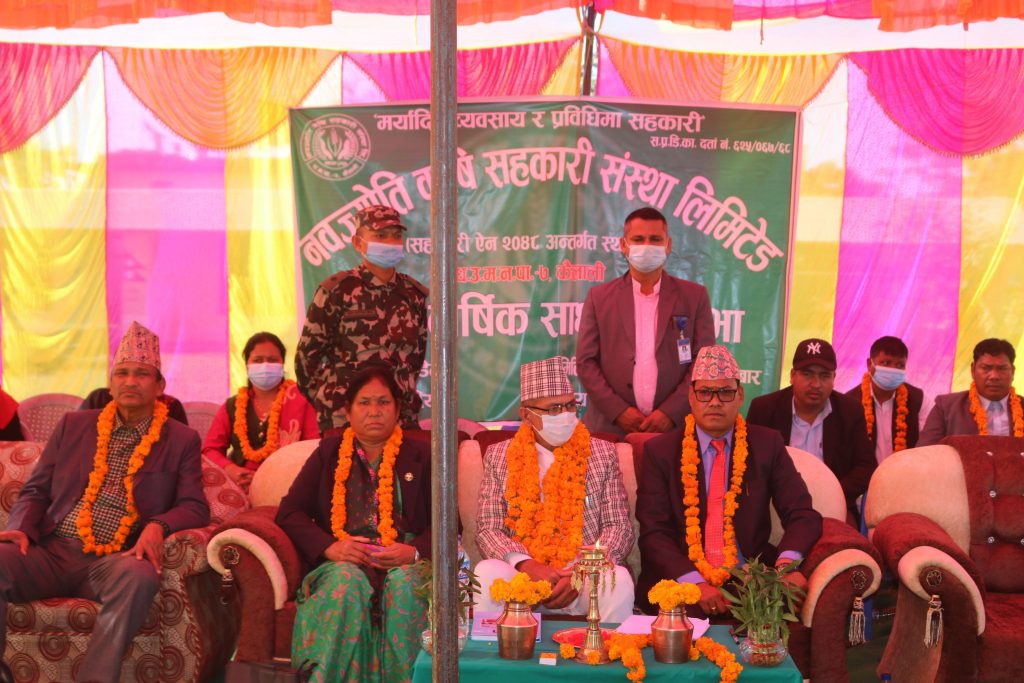 कार्यक्रम वडा नं. ७ का वडा अध्यक्ष तथा संस्थाका अध्यक्ष सिताराम रानाको सभापतित्वमा भएको थियो । कार्यक्रमका प्रमुख अतिथी प्रदेश प्रमुख देवराज जोशी रहनु भएको थियो । वहाँले भन्नु भयाे याे सहकारी जस्तै अरू सहकारीहरूले पनि प्रगति गरोस । नव ज्याेति कृषि सहकारी संस्थाले धनगढी उपमहानगर पालिकाकाे नभइ कैलाली जिल्लाकाे सहकारी संस्थाहरू मध्ये अग्रेणी भुमिका खेलेकाे बताए ।