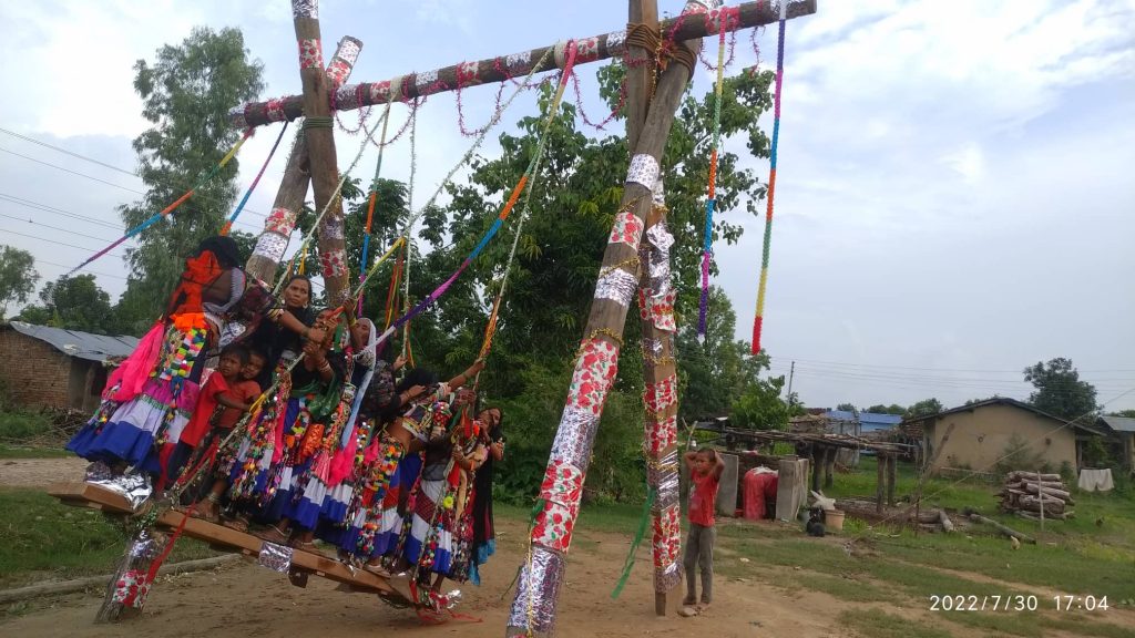कैलाली १४ सावन २०७९ । सुन्दर सुदूरपश्चिम कैलाली र कञ्चनपुर बसोवास गर्ने राना थारु समुदायको परम्परागत ‘तीज’ पर्वको रौनक छ । राना थारु बस्तीमा डोला हालिएका छन् । परम्परागत पोशाकमा सजिएका कैलारी गाउपालिका ९ गदरेहा गांव स्थित रानाथारू समुदायका महिला पिङ खेल्दै शनिबार साउनको परम्परागत गीत गुनगुनाउनु भएका छन् ।विवाहित छोरीचेली माइती फर्किएका छन् । राना थारु समुदायमा तीज अन्य समुदायको तुलनामा निकै फरक गरी मनाइन्छ ।