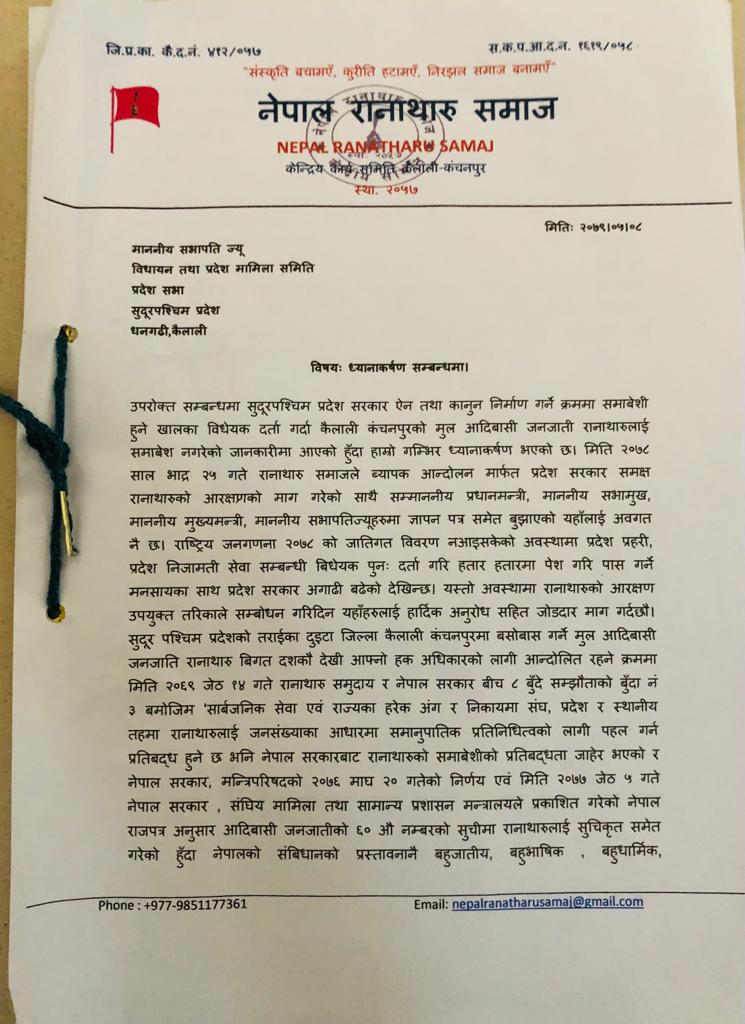 उपाध्यक्ष रानाले भने रानाथारुको आरक्षणको लागि गत वर्ष मिति २०७८।५। २५ गते नेपाल रानाथारुको नेतृत्वमा कैलाली र कञ्चनपुरका विभिन्न १६वटा रानाथारु जातिय संघ संस्थाहरुले संयुक्त रुपमा विरोध र आन्दोलन गरेका थिए । साथै सुदुरपश्ञ्चिम प्रदेश मुख्य मन्त्री, प्रदेश सभामुख र विधायन तथा प्रदेश मामिलिा समितीमा ज्ञापन पत्र समेत बुझाएका थियौ भनेर जानकारी दिनु भयो ।