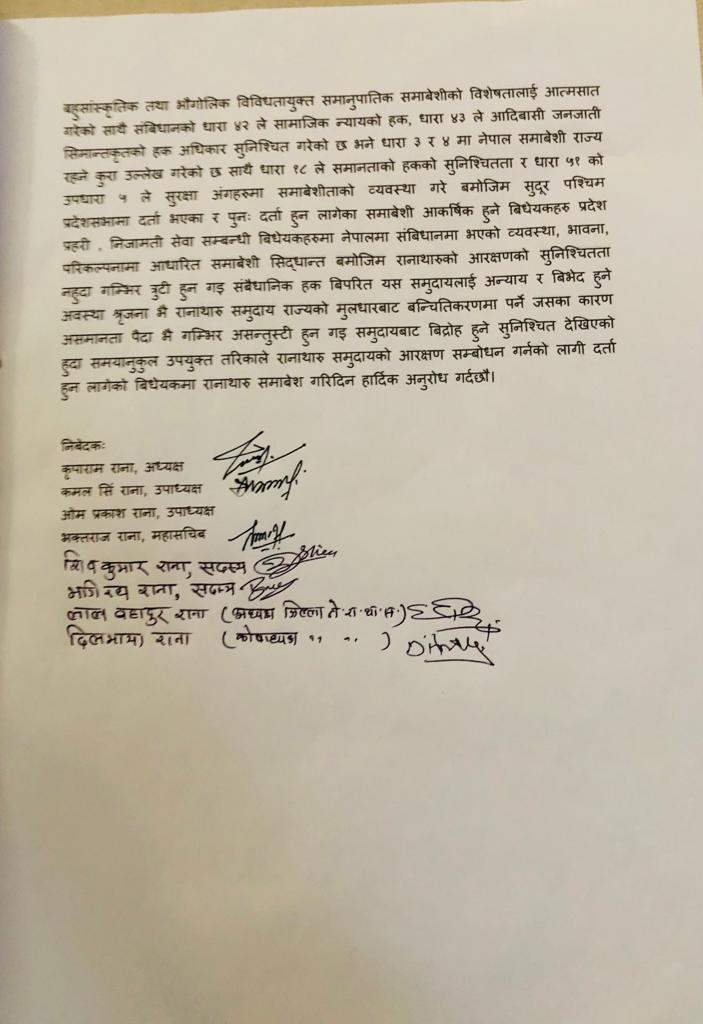 सो क्रममा सोहि मितिमा नेपाल रानाथारु समाज केन्द्रिय उपाध्यक्ष कमल सिं रानाको नेतृत्वको टोलीले ध्यानकर्षण पत्र सहित थारु/रानाथारु आरक्षणको लागि अत्याधिक दवाव सृजना र पहल कदमी गरि सो बिधेयकमा थारु/रानाथारुको १३ प्रतिशत आरक्षण सुनिश्चित गराउन सफल भएको जानकारी दिनुभयो ।