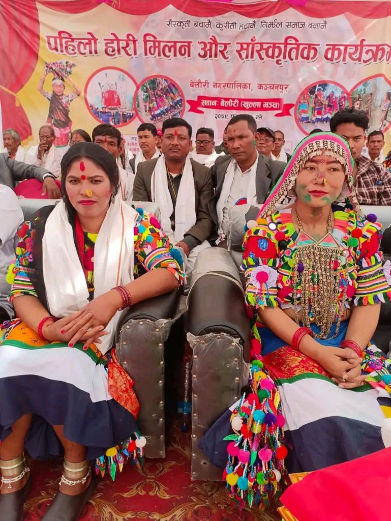 नरेश राना/कञ्चनपुर, २० फागुन । कञ्चनपुरको बेलौरी नगरपालिकाको खुल्ला मञ्चमा पहिलो होली मिलन तथा साँस्कृतिक कार्यक्रम सम्पन्न भएको छ। सुरेश कुमार बडाएकको अध्यक्षतामा भएको होरि मिलन कार्यक्रममा प्रमुख अतिथि पूर्व खानेपानी मन्त्री बिना मगर रहनु भएको थियो। कार्यक्रममा नगरपालिका का सम्पूर्ण वार्ड बाट राना थारु को होरीको नाचबाट नै होरी मिलन कार्यक्रम सम्पन्न भएको थियो।