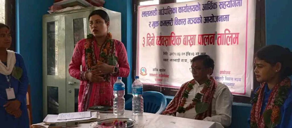 कार्यक्रम मा प्रमुख अतिथि लालझाडी गाउँपालिका का अध्यक्ष निर्मल राना ले हाम्रो पालिका मा सबै वडा मा छरिएर बसेका मुक्त कमलरी हरु लाई हामी केही राहत को लागि थोरै बजेट भए पनि हामी व्यवसाय तालिम दिएका छौ यो तालिम लिएर अपनो व्यवसाय फस्टाउने छौ भने आशा लिएको छु ।