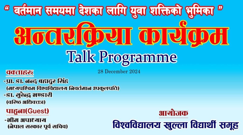 बिश्वबिद्धालय खुल्ला विद्यार्थी समूहको आयोजनामा पुस १३ गते त्रिभुवन विश्वविद्यालय (TU) को राजनीतिक विज्ञान विभागमा एक अन्तरक्रिया कार्यक्रम सम्पन्न भयो।