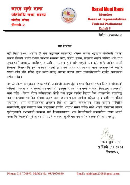 बेपत्ता परेका ब्यक्तिहरुको खोजी तथा उद्दार कार्यमा तिब्रता दिन ध्यानाकर्षण गराउँदछु। यस अवस्थामा प्रभावित क्षेत्रमा उद्धार तथा व्यवस्थापनका कार्यमा खटेकासुरक्षाकर्मी, सामाजिक संघसंस्था, आम नागरिकहरूमा धन्यवाद दिदै थप उद्दार, ब्यवस्थापन, राहत कार्यमा लागिदिन समाजसेबी, युवा लगायत आम समुदायमा हार्दिक अनुरोध समेत गर्दछु। साथै आउने दिनहरुमा मौसम पूर्वानुमानको प्रभावकारी व्यवस्था गर्न, किसानलगायत आम नेपालीहरूले अप्रत्यासित रुपमा आउने यस्ता विपत्तिहरूको पूर्व जानकारी पाउने व्यवस्था सुनिश्चित गर्न समेत सरकारसँग माग गर्दछु भन्ने कुरा उक्त विज्ञप्तिमा भनिएकाे छ ।