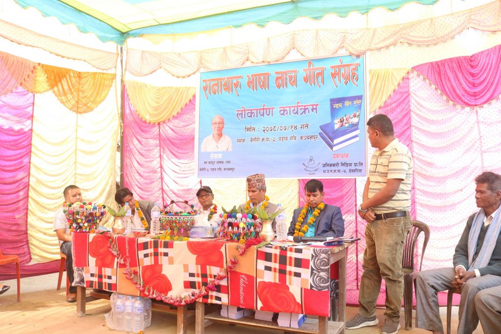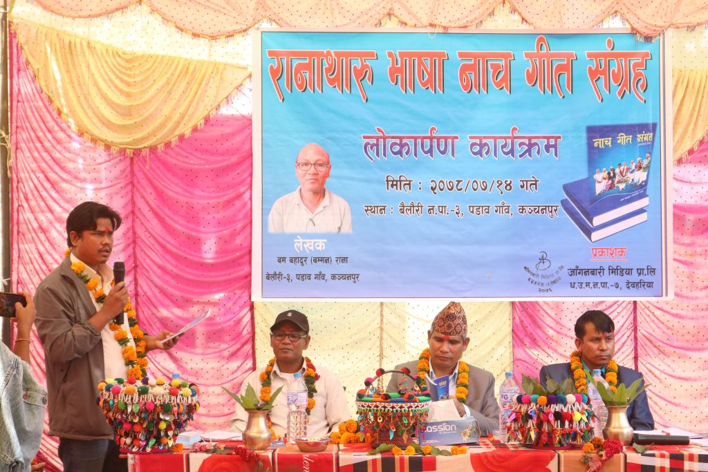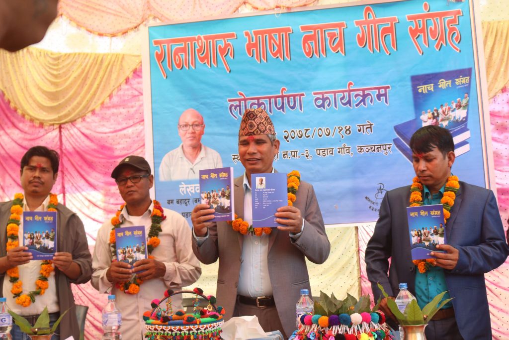 रानाथारु भाषाको “नाच गीत संग्रह” नामक किताबको लोकाअर्पण कार्यक्रम सम्पन्न भएको भएको छ । बेलाैरी नगर पालिका वडा नं. ३ पडाव गाउँ बस्ने बम बहादुर ( बम्मन) रानाले लेखेका हुन । उक्त किताब आँगनबारी मिडिया प्रा.लि. धनगढी ७ देवाहरिया, कैलाली द्वारा प्रकाशन भएको हो । कार्यक्रम संस्थाका अध्यक्ष नन्दलाल रानाको सभापतित्वमा सम्पन्न भएको थियो ।