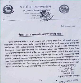 उपमहानगरपालिकाका प्रमुख प्रशासकीय अधिकृत रामलाल श्रेष्ठले एक सूचना जारी गर्दै नियमित कार्य सम्पादनको क्रममा कार्यालयका केही कर्मचारीहरुलाई कोभिड–१९ संक्रमण पुष्टि भएको र केही कर्मचारीलाई मिल्दोजुल्दो लक्षण देखा परेर आईसोलेसनमा रहेको साथै कार्यालयमा सेवाग्राहीको भिडभाड समेत भइ कार्यालयबाटै कोरोना संक्रमण फैलिने जोखिम रहेकोले अत्यावश्यक बाहेकका सबै सेवा बन्द गरिएको सूचनामा उल्लेख छ ।