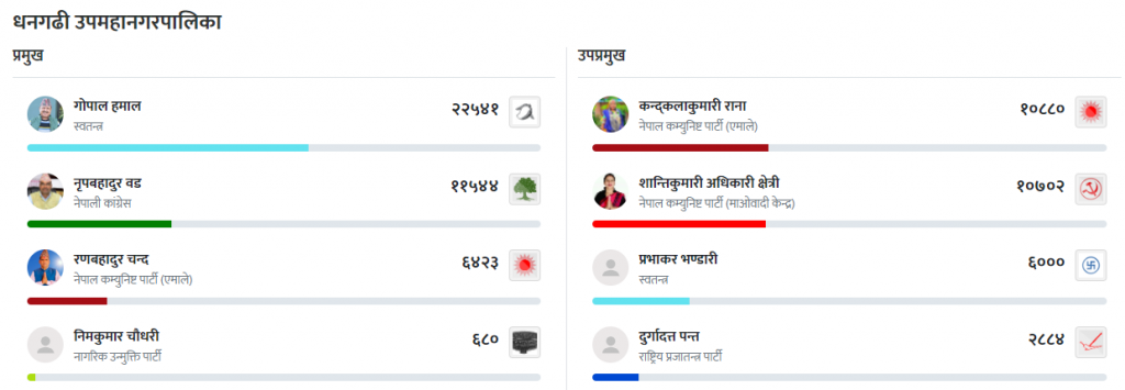 अइसि करके नेकपा एमालेके उम्मेदवार रणबहादुर चन्द ६ हजार ४२३ मत लइके तेस्रो स्थानमे हए । उपमेयरमे माओवादी केन्द्रकी शान्ति अधिकारीके एमालेकी कन्दकला राना पच्छु छाेडी हए । रानाकि १० हजार ८८० औ अधिकारीकि १० हजार ७०२ मत पाइ हए ।