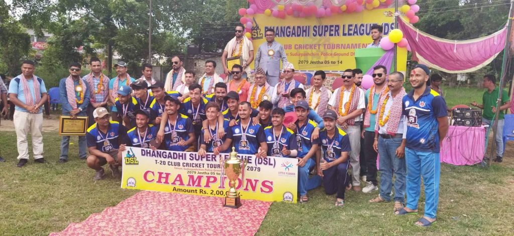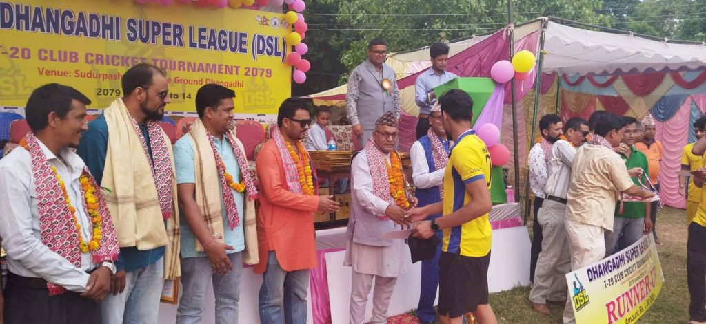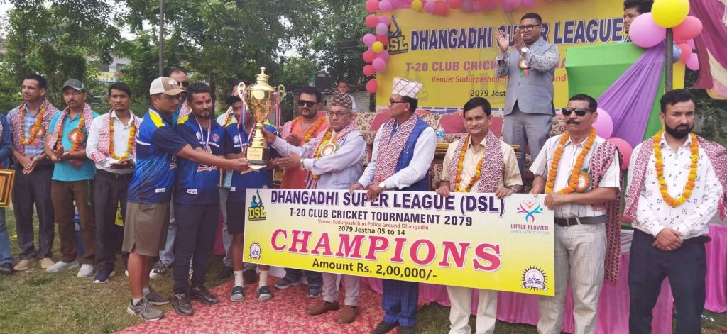 धनगढीमा जारी लिटिल फ्लावर स्पोर्ट्स ईभेन्ट धनगढीद्घारा अायोजित धनगढी सुपर लिग (DSL) T-20 क्लब क्रिकेट प्रतियोगिता २०७९को समापन समारोहलाई संबोधन गर्नुहुदै कार्यक्रमका प्रमुख अतिथि एंव सुदूरपश्चिम प्रदेशका सामाजिक बिकास राज्यमन्त्री रैका ले उक्त कुरा बताउनु भएको हो ।