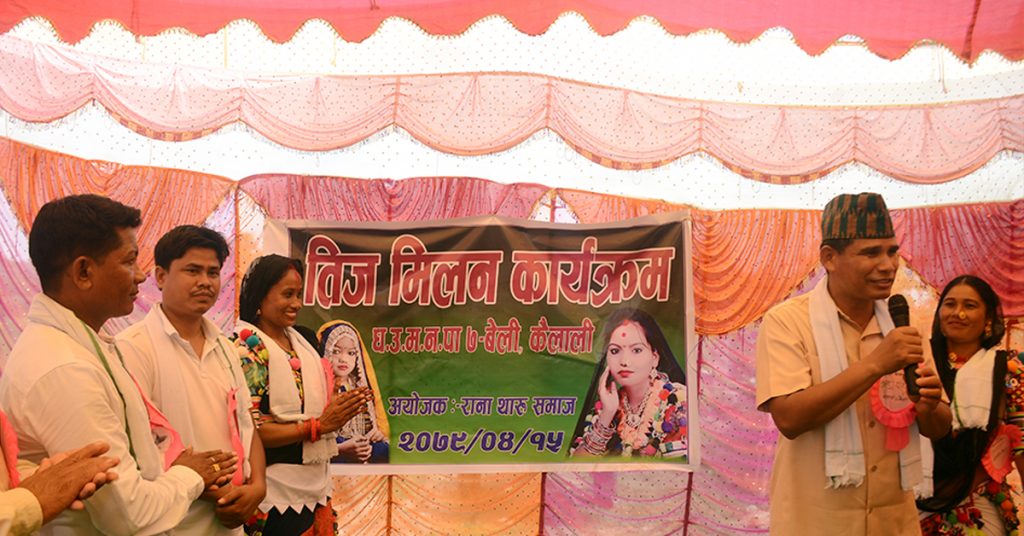राममिलन राना /धनगढी १५ सावन । रानाथारुकाे विशेष तिज पर्वके उपलक्ष्यमे धनगढी उप-महानगरपालिका वडा नम्बर ७ बेली गाउँमे तिज मिलन कार्यक्रम २०७९ सम्पन्न भओ हय।कार्यक्रम सन्चालक मे रघुनाथ ओझा रहञ। कार्यक्रके सभापती राना थारु समाज बेली गाउँ की अध्यक्ष राजकुमारी रानाके सभापतित्वमे सम्पन्न भओ रहए । राम औतार राना रहयन।कार्यक्रमके प्रमुख अतिथी कैलाली क्षेत्र नम्बर ५ के प्रतिनिधि सभा सद्स्य तथा पुर्व वन तथा वातावरण मन्त्री नारदमुनि राना रहएँ । माननिय राना कहि रानाथारुकि कला ,संस्कृति ,रितिरिवाज बचानके ताँहि एकता ,सहयोग और जनचेतना कि बहुत जरुरी हय बताइ हए । और कार्यक्रममे बिशिस्ट अतिथीमे नगढी उपमहानगर पालिकाकि उपप्रमुख कन्दकला राना रहए । आज १५ गते रानाथारुक तीज पर्वके उपलक्ष्यमे धनगढी उपमहानगरपालिका भर सर्बजनिक बिदा की घाेषणा गराेगओ हए । बे कहि यदि मिर ठाउँ मे और कोइ दुस्रो हुइतो तौ आज ज बिदा साइत न मिल्पातो। तभिक मारे राजनितीमे फिर राना थारु दिदी बहिनिया ददा भैया, सबय के अग्गु बढन जरुरी हय बताइ उपप्रमुख राना ।