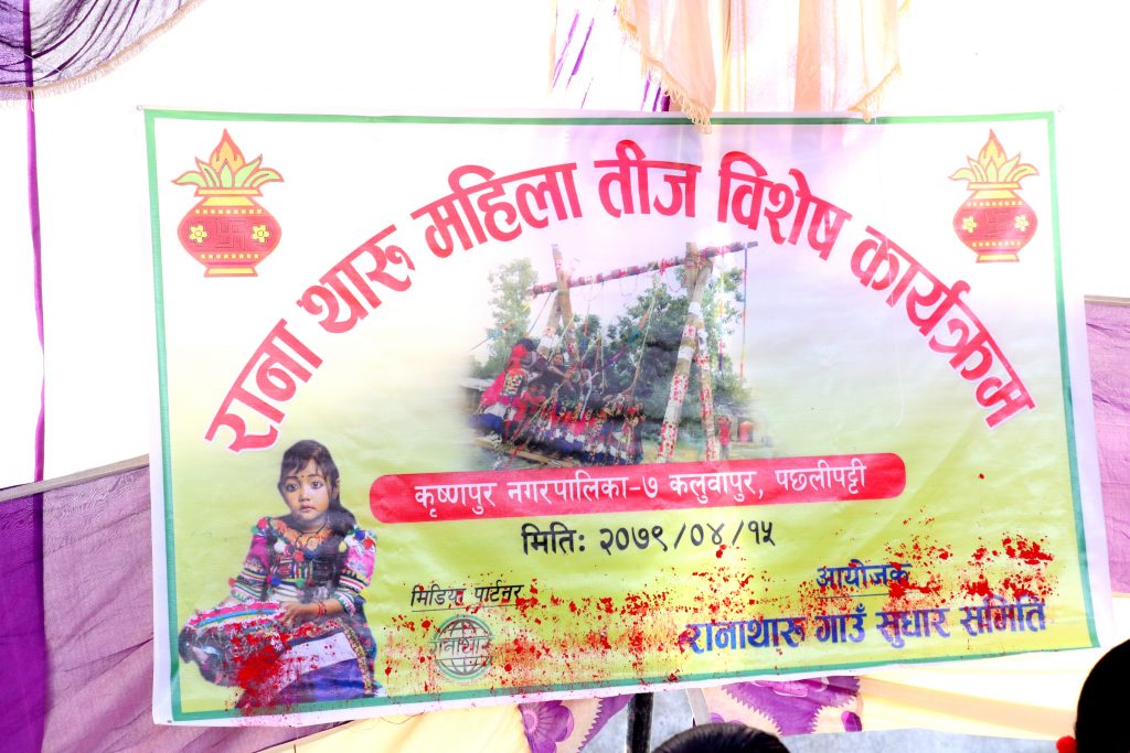 यस्तै कृष्णपुर नगरपालिकाका उप–प्रमुख द्रोपति रानाले नगरपालिकाबाट रानाथारु संग्रहालयको निर्माणको लागि कलुवापुर गाउँका रानाथारु दाजुभाईहरुको लागि बैण्ड बाजाको लागि बजेट बिनियोजन गरेको जानकारी गराउनु भएको थियो । उहाँले रानाथारु तीजको गीत गाएर रानाथारु महिलाहरुलाई तीजको असिम शुभकामना दिनुभएको थियो ।