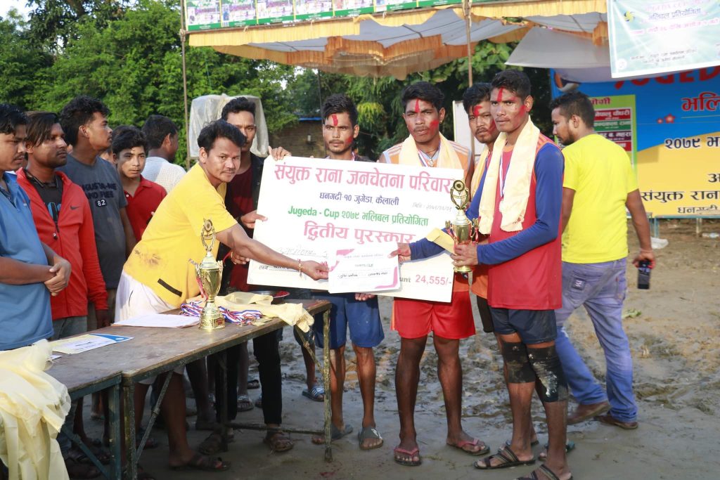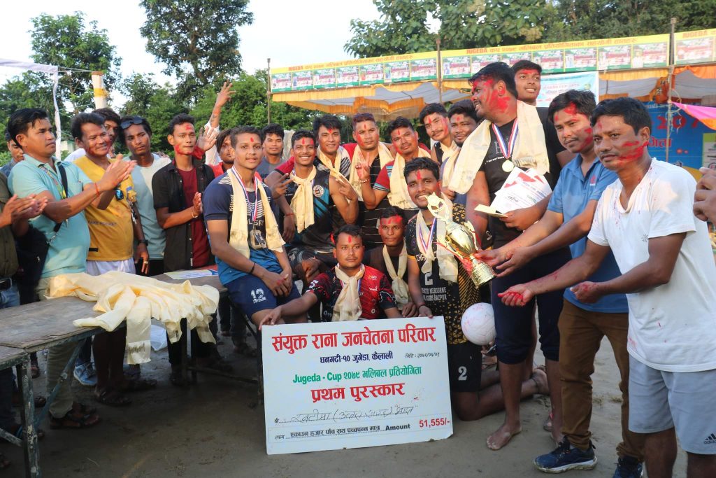 दिनेश राना/कैलाली, १ क्वाँर । कैलालीको धनगढी उपमहानगरपालिका वडा नं १० स्थित जुगेडा गाउँमा जुगेडा कप संयुक्त राना जनचेतना परिवार बाट आयोजित भलिबल प्रतियोगिता समापन भएको छ । भलिबल प्रतियोगिता भदौ २६ गते देखी शुरू भएको थियो । उक्त खेलमा २८ टीम को सहभागितामा आज असोज १ गते आज समापन भएको छ ।