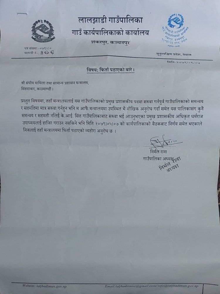 नरेश राना/कञ्चनपुर, असोज १० । कञ्चनपुरको लालझाडी गाउँपालिकाले नयाँ प्रमुख प्रशासकीय अधिकृतलाई फिर्ता पठाएको छ ।