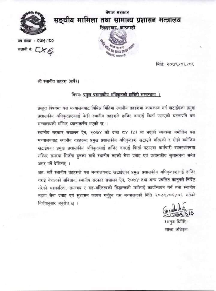 यता मन्त्रालयले भने कामकाज गर्न खटाएका प्रमुख प्रशासकीय अधिकृतलाई हाजिर नगराई फिर्ता पठाएको घटनाप्रति गम्भीर ध्यानाकर्षण भएको जनाएको छ । स्थानीय सरकार ऐन,२०७४ को दफा ८४(४) मा भएको व्यवस्था बमोजिम मन्त्रालयबाट स्थानीय तहमा प्रमुख प्रशासकीय अधिकृत खटाउने गरिएकोले सोही बमोजिम खटाएका प्रमुख प्रशासकीय अधिकृतलाई हाजिरी नगराई फिर्ता पठाउँदा कर्मचारी व्यवस्थापनमा गम्भीर समस्या सिर्जना भएको जनाएको छ । मन्त्रालयले खटाएका प्रमुख प्रशासकीय अधिकृतलाई हाजिरी गराई नेपालको संविधान, स्थानीय सरकार ऐन, २०७४ तथा अन्य प्रचलित कानूनले निर्दिष्ट गरेको सहकारिता, समन्वय र सहअस्तित्वको सिद्धान्तको मर्मलाई कार्यान्वयन गर्न आग्रह गरेको छ ।