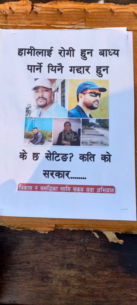 त्यहाँका स्थानीय सकृय युवा समाजसेवी सन्तोष चौधरीकाे अगुवाइमा प्रभु रानाको संयाेजकत्वमा गठित समितिका सम्पुर्ण सकृय युवाहरू र गाउँटाेलबासी द्वारा आज शान्त तथा मौनतापुर्ण रुपले सरकार तथा ठेकेदारलाई चुनौती दिएका छन् ।पम्पलेटमा बिभिन्न प्रश्नहरु देखाएर मौनरुपमा चुनौती दिदै यथासिघ्र बाटो निर्माण तथा खानेपानी मर्मत सम्भारका कार्य सञ्चालन नगरे सशक्त अन्दोलन गर्ने सन्तोष चौधरीले बताएका छन् ।