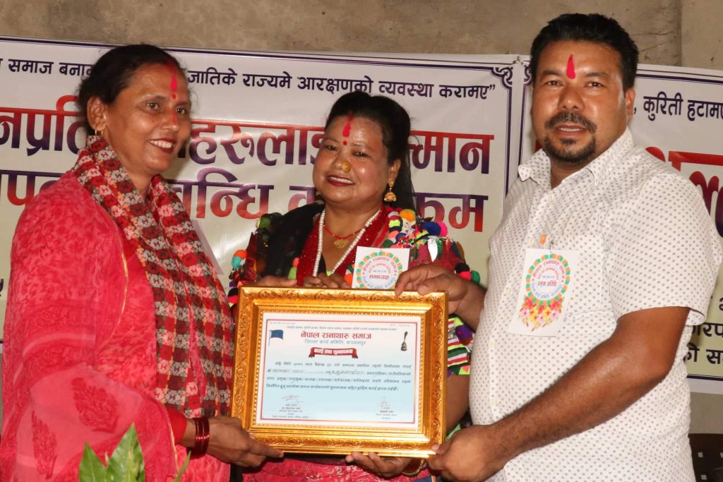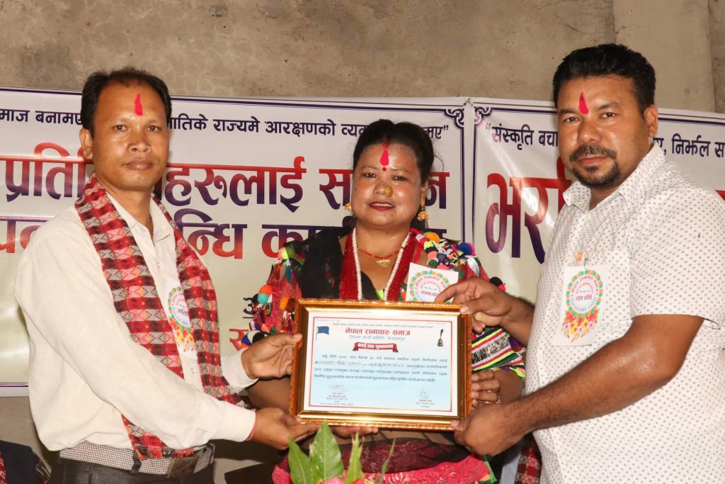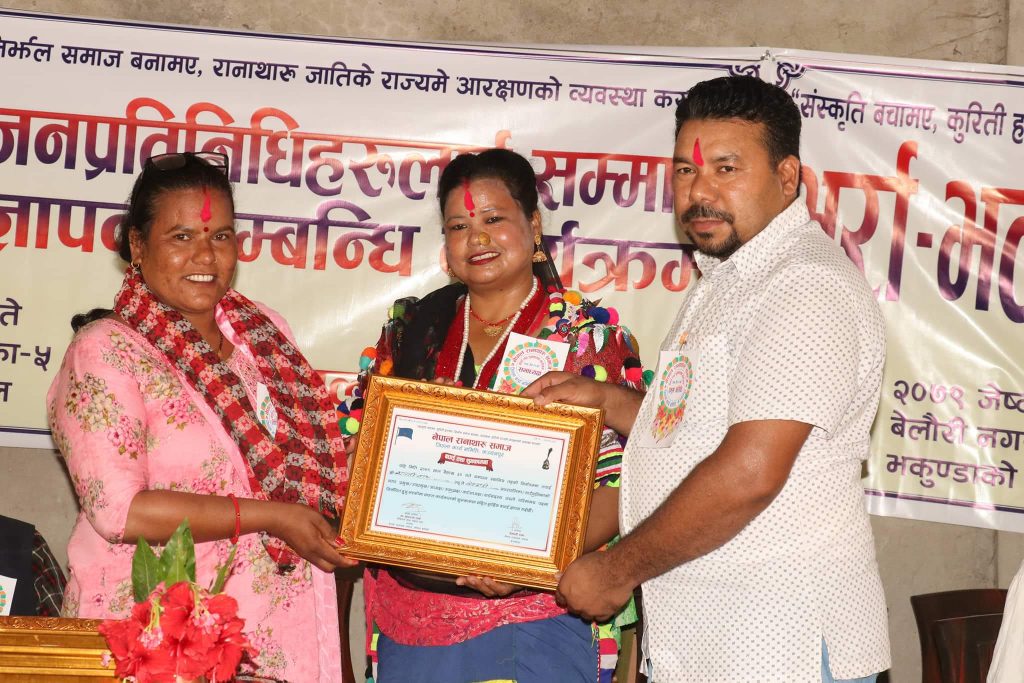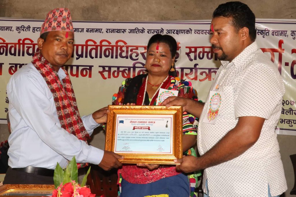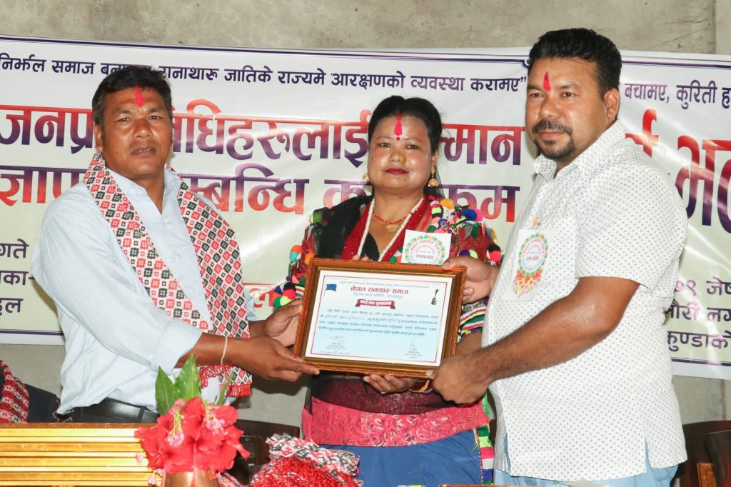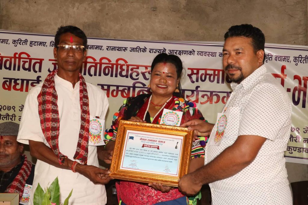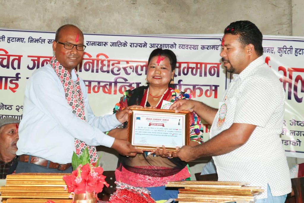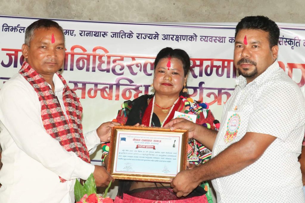 कार्यक्रम मे नेपाल रानाथारु समाज कञ्चनपुर के अध्यक्ष श्री प्रेमवती राना तथा माननीय सभासद श्री कृपाराम राना द्वारा कञ्चनपुर जिल्लाके सबय नगरपालिका तथा गाउँपालिका के प्रमुख, उपप्रमुख और रानाथारु प्रतिनिधिनके सम्मान तथा बधाई दव गव हय।कार्यक्रम मे भिमदत्त नगरपालिका के प्रमुख पदम बोकटी कहि ” मोसे पदम राना फिर कहसकत हव काहे कि मय जलमत से रानाथारु समुदायमे पलो बढो हवँ ” ।