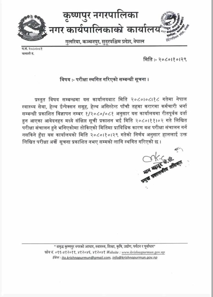 नगरपालिकाले गत मंसिर १८ गते प्राविधिकतर्फ हेल्थ असिस्टेन्ट पाँचौ तहमा ८ जना कर्मचारी करारमा भर्ना गर्न सूचना निकालेको थियो । जसअनुसार फागुन २ गते लिखित परीक्षाको कार्यतालिका थियो । प्राविधिक कारणले तोकिएको मितिमा परीक्षा सञ्चालन गर्न नसकिने भएकाले अर्को सुचना प्रकाशित नभएसम्मका लागि परीक्षा स्थगित गरिएको नगर प्रमुख हेमराज ओझाले बताए ।