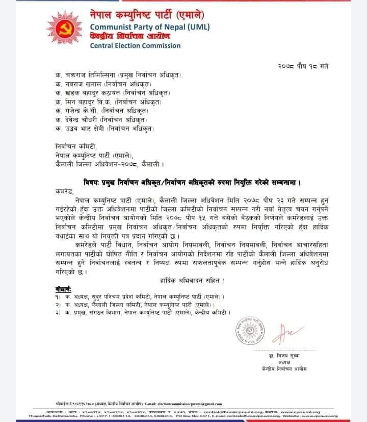 नेपाल कम्युनिष्ट पार्टी ( एमाले ) जिल्ला अधिवेशन सम्पन्न गर्नका लागि केन्द्रिय निर्वाचन आयोगले जिल्लामा निर्वाचन अधिकृत तोकेको छ । केन्द्रिय निर्वाचन आयोगको मिति २०७८ पुस १५ गते बसेको बैठकले उक्त जिम्मेवारी जिल्ला स्थित निर्वाचन कमिटीका प्रमुख निर्वाचन अधिकृतलाई दिएको हो ।