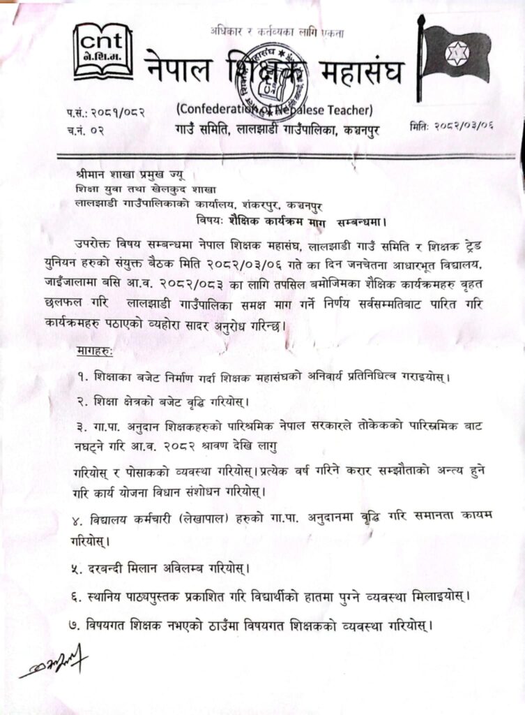 लालझाडीमा नेपाल शिक्षक महासंघद्वारा शैक्षिक कार्यक्रम सम्बन्धी माग पत्र बुझाइयो