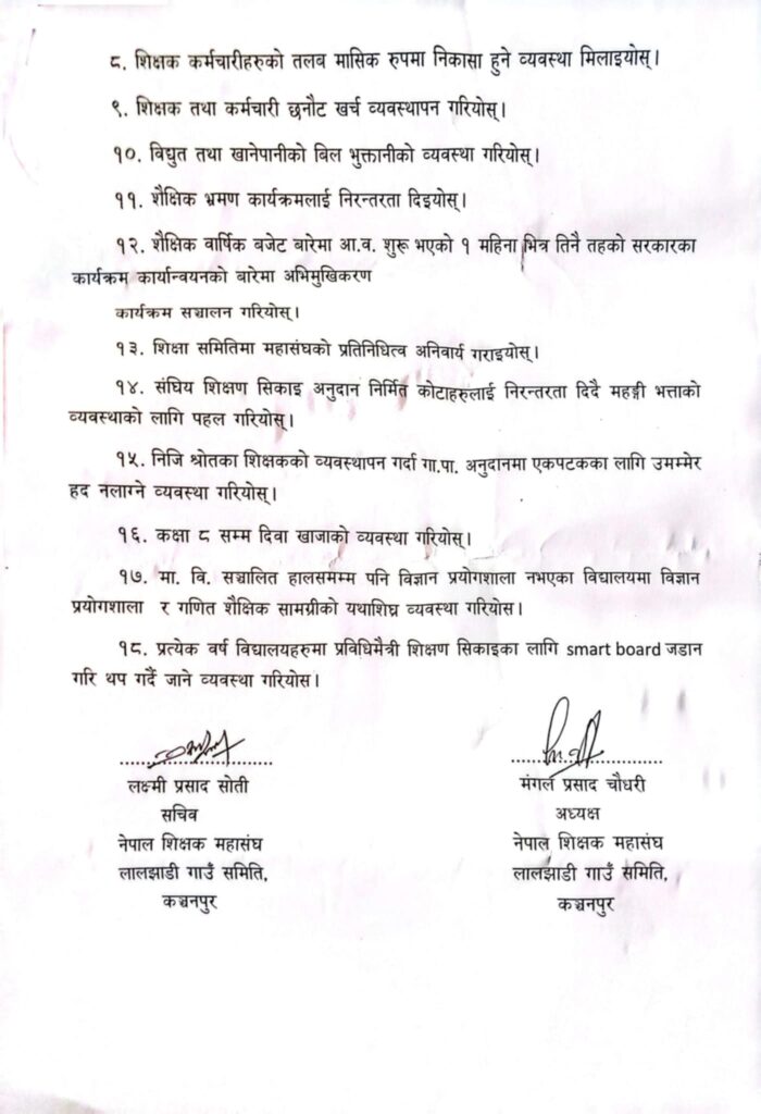 मागपत्रमा उल्लेख गरिएका प्रमुख मागहरू निम्नानुसार छन्: