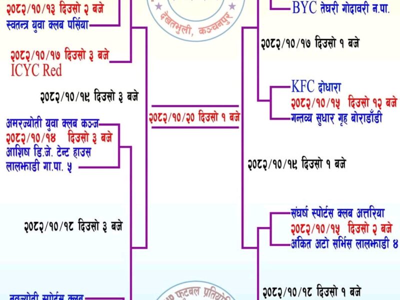 आज हुने भनिएको पहिलो खेल ICYC YOLLO र BYC तेघरी बीचको प्रतिस्पर्धा मौसम प्रतिकूलताका कारण स्थगित गरिएको आयोजकले जानकारी गराएको छ। उक्त खेल भोलि दिउँसो ३ बजे हुने जनाइएको छ।