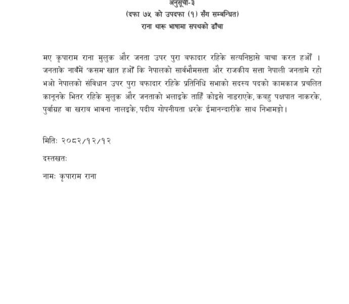 यसैबीच, कञ्चनपुरबाट समानुपातिक प्रणालीमार्फत निर्वाचित सांसद कृपाराम राना र गीता चौधरीले मातृभाषामै शपथ लिने तयारी गरेका छन्। कृपाराम रानाले रानाथारू भाषामा तथा गीता चौधरीले थारू भाषामा शपथ लिने जनाइएको छ।