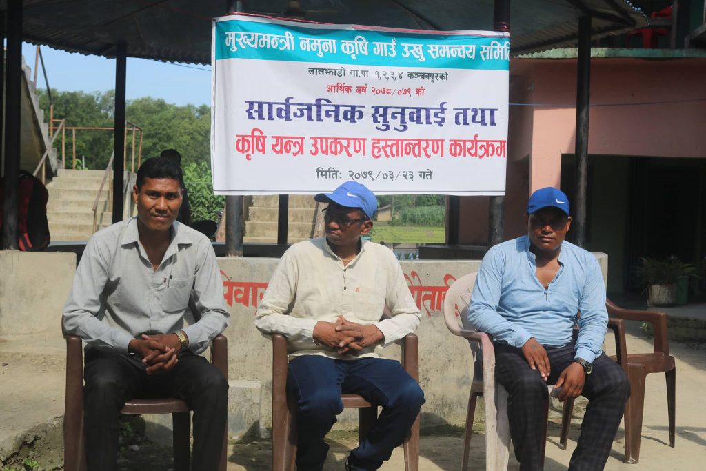 कार्यक्रममा प्रमुख अतिथि लालझाडी गा.पा काअध्यक्ष श्री अध्यक्ष निर्मल राना रहनु भएको थियो ।अथिति वार्ड नं ३ का वार्ड अध्यक्ष टीकाराम डागौरा रहनु भएको कार्यक्रममा कृषि ज्ञान केन्द्रका प्रतिनिधि श्री आशीष पाठकले सो कार्येक्रमको सहजिकरण गरी कार्येक्रम संचालन गर्नु भएको थियो। सो कार्येक्रम कृषि ज्ञान केन्द्र महेन्दनगरको ५०% अनुदानमा लालझाडीका किसानलाई पम्पसेट २३ थान ,रोटाभेटर ४ थान, कल्टीभेटर १ थान, सिचाई मोटर ४ थान गरी जम्मा ३२ समान बितरण गरी किसानलाई अझै कृषि पेशमा आत्मा निर्भर हुना सहज भएको लालझाडी गाऊपालिकाका अध्यक्ष निर्मल रानाले सम्पूर्ण किसानलाई जानकारी गराउनु भएको थियो।